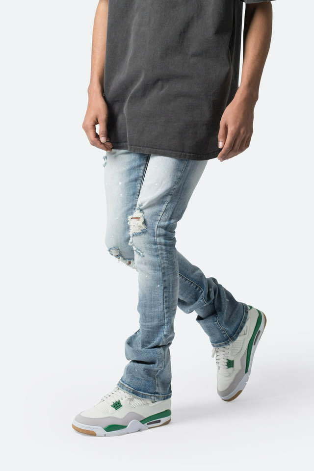 ペイント加工とクラッシュを施したヴィンテージウォッシュのストレッチデニム生地を用いたスキニーフィットのフレアデニムパンツ。裾が溜まるトレンドスタイルの美麗シルエットが病みつきになること間違いなし。