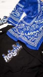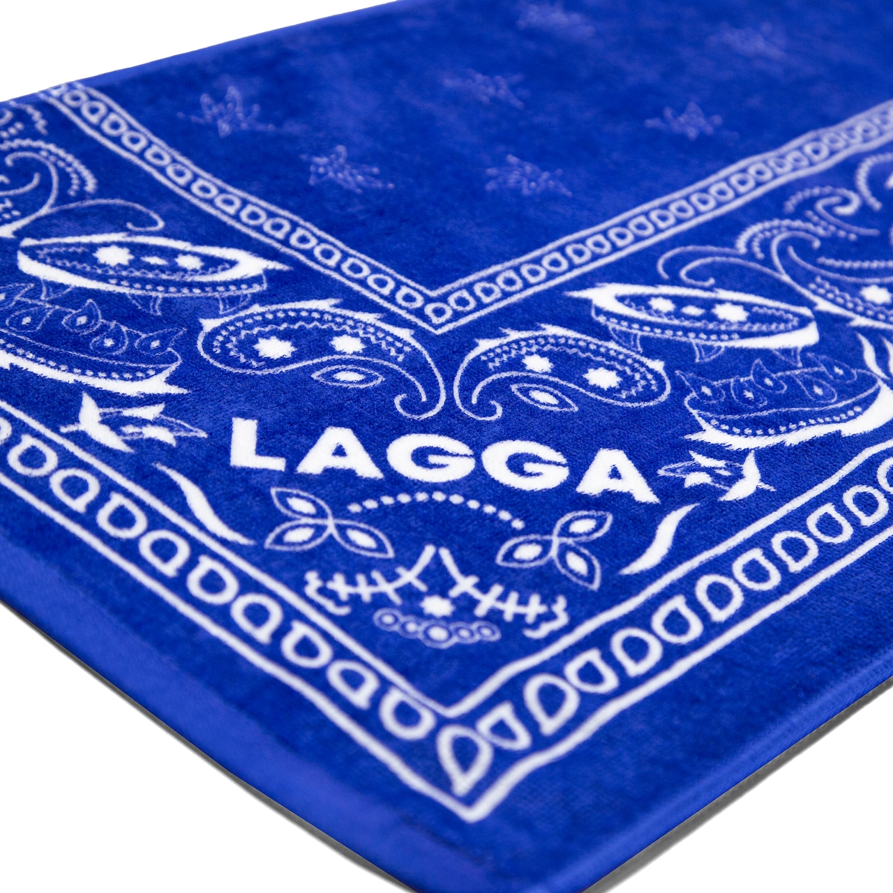 ブランドオリジナルのスモーキーなモチーフを加えたペイズリー柄を全面にデザインし、顔料プリントで表現。LAGGAのコンセプトカラーであるブルーを基調とし、存在感のある仕上がりとなっています。さらに今治産ならではの上質なクオリティで、使い心地と耐久性も兼ね備えた特別仕様の一枚です。