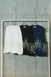 ピンストライプで構築された、重なり合うフレイムスが印象的なLS Tee。2層に配置されたフレイムス柄は、それぞれ異なるギミックを採用。暗闇で光を放つ蓄光プリントと光を反射するリフレクタープリント。昼夜で異なる表情を演出する。シンプルな中に遊び心とインパクトを落とし込んだ一枚。