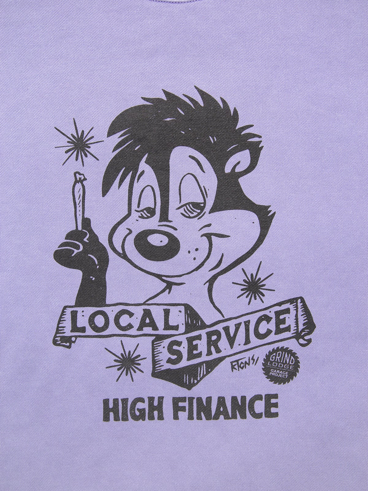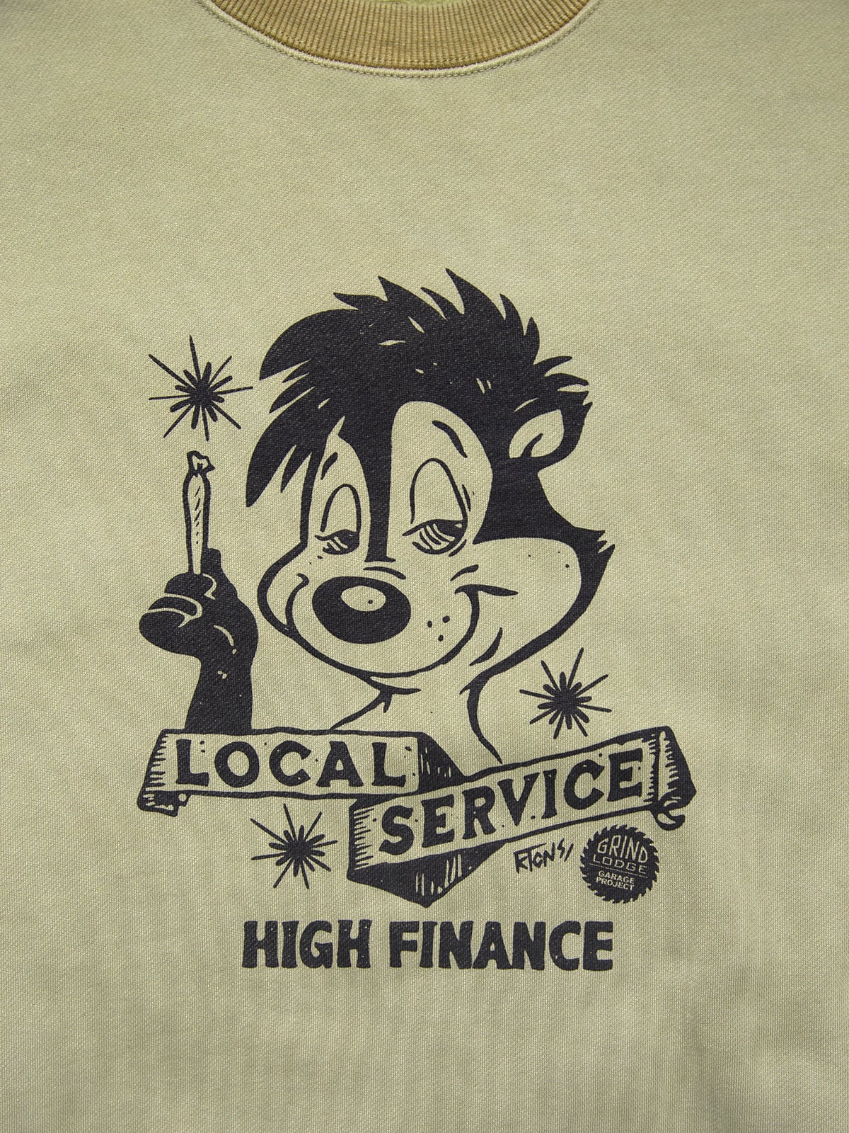 デザイナー"KTCN"制作のグラフィックを、染み込みプリントでフロントに大きく配置。特徴のあるタッチのスカンクのキャラクターとメッセージが実にKTCNらしい、ユニークな世界観を表現。ボディはコットン100%の裏毛生地にピグメントダイ加工を施し、時間が経つほどに風合いが増すエイジングも楽しめる仕様。左袖にはGRINDLODGE × HAIGHTのコラボロゴ刺繍入り。