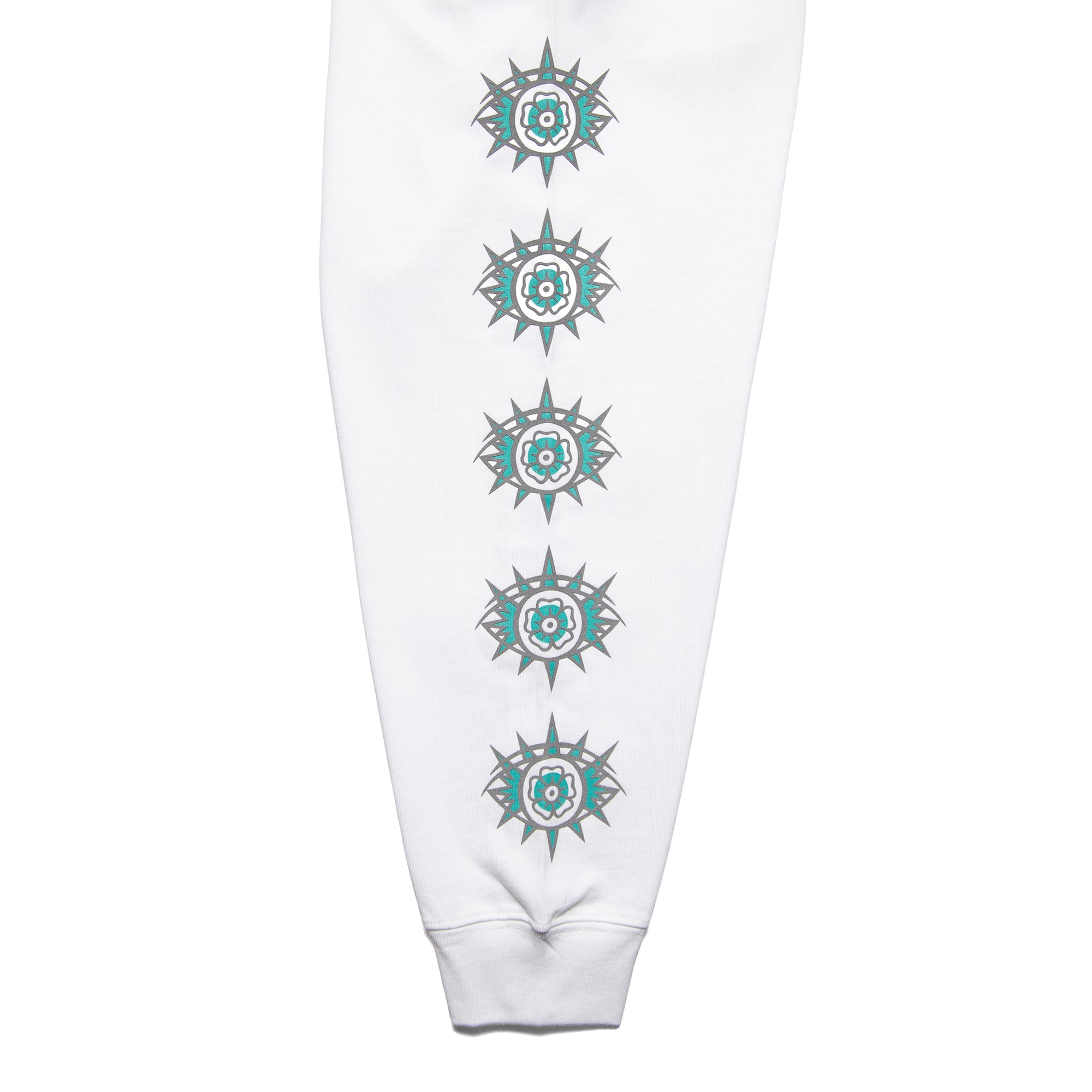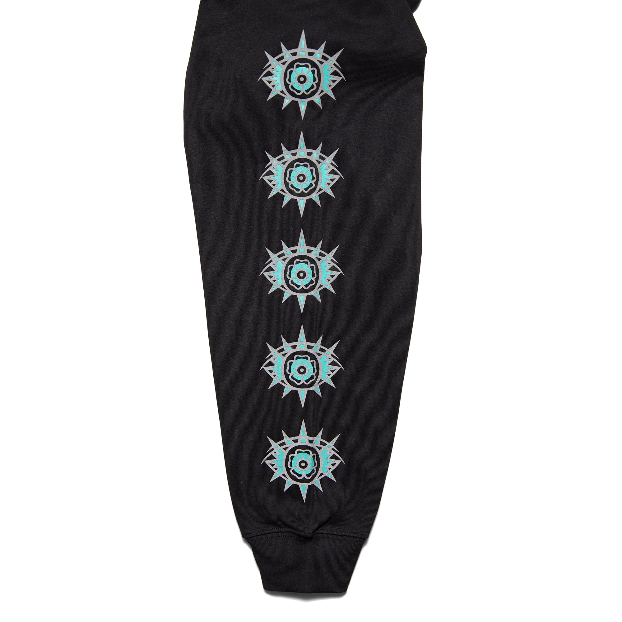 GRINDLODGEの象徴的なグラフィックのひとつである“目”のモチーフに今回のコラボのために制作されたグラフィック「全てを見通す目」。それを両袖にプリントで大胆に配置。リフレクタープリントを掛け合わせ、光を受けて浮かび上がるギミックを加えることで、グラフィックにさらなる奥行きをプラス。フロントには小ぶりなロゴで、バランスの取れたデザインにまとめた。日中と夜で異なる表情を見せる、視線と存在感を引き寄せる一枚。