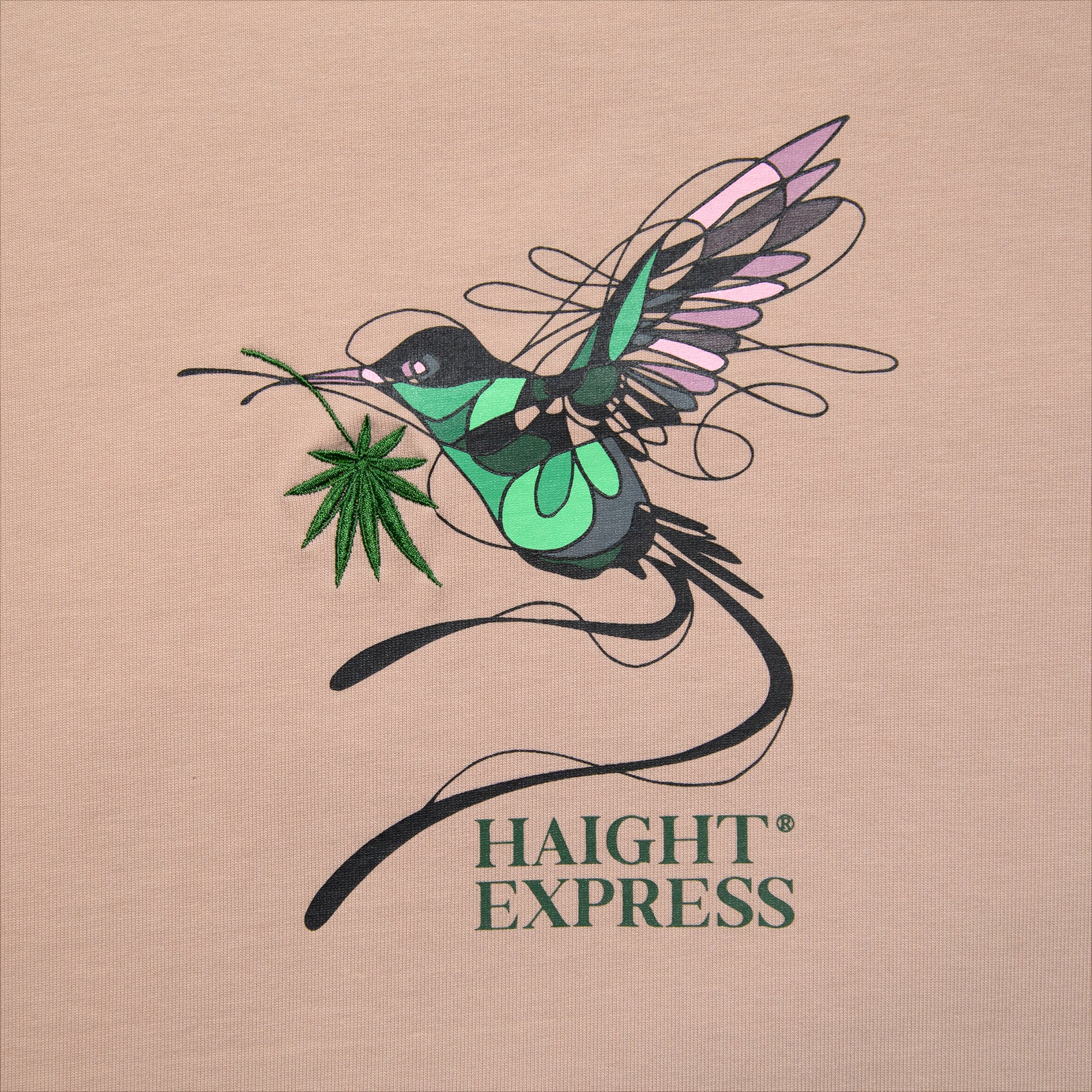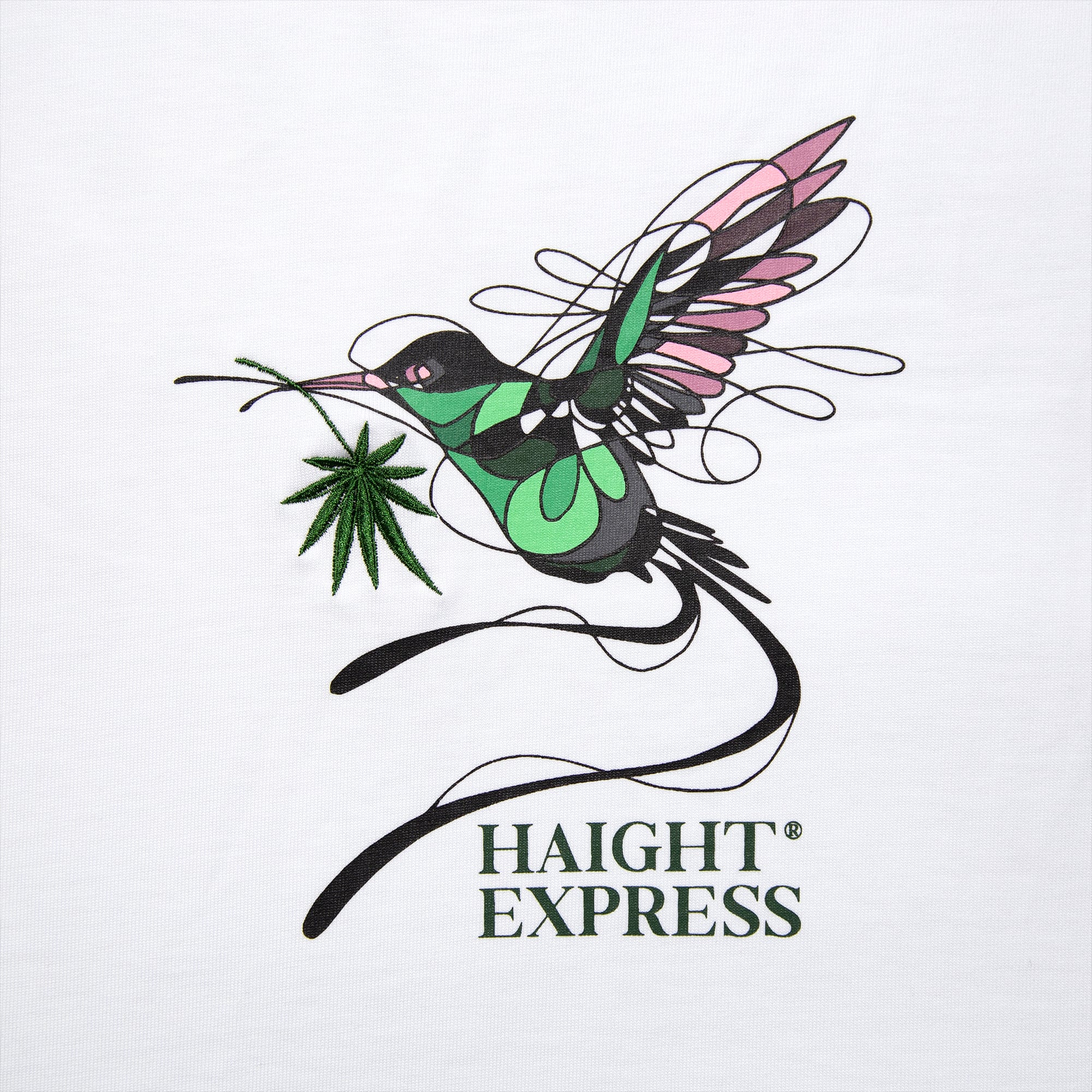ジャマイカの国鳥「ハミングバード」をモチーフに、リーフをくわえて舞う姿を、特徴のある流線的ラインで繊細かつダイナミックに表現。リーフ部分に立体感のある刺繍を施し、それ以外を多色刷りのシルクスクリーンプリントで構成。異なる表現のコンビネーションが、アートの魅力をいっそう引き立てます。12.5ozのスウェット並みのヘビーオンス生地を使用し、Tシャツの軽快さとスウェットの重厚感を両立した一枚。
