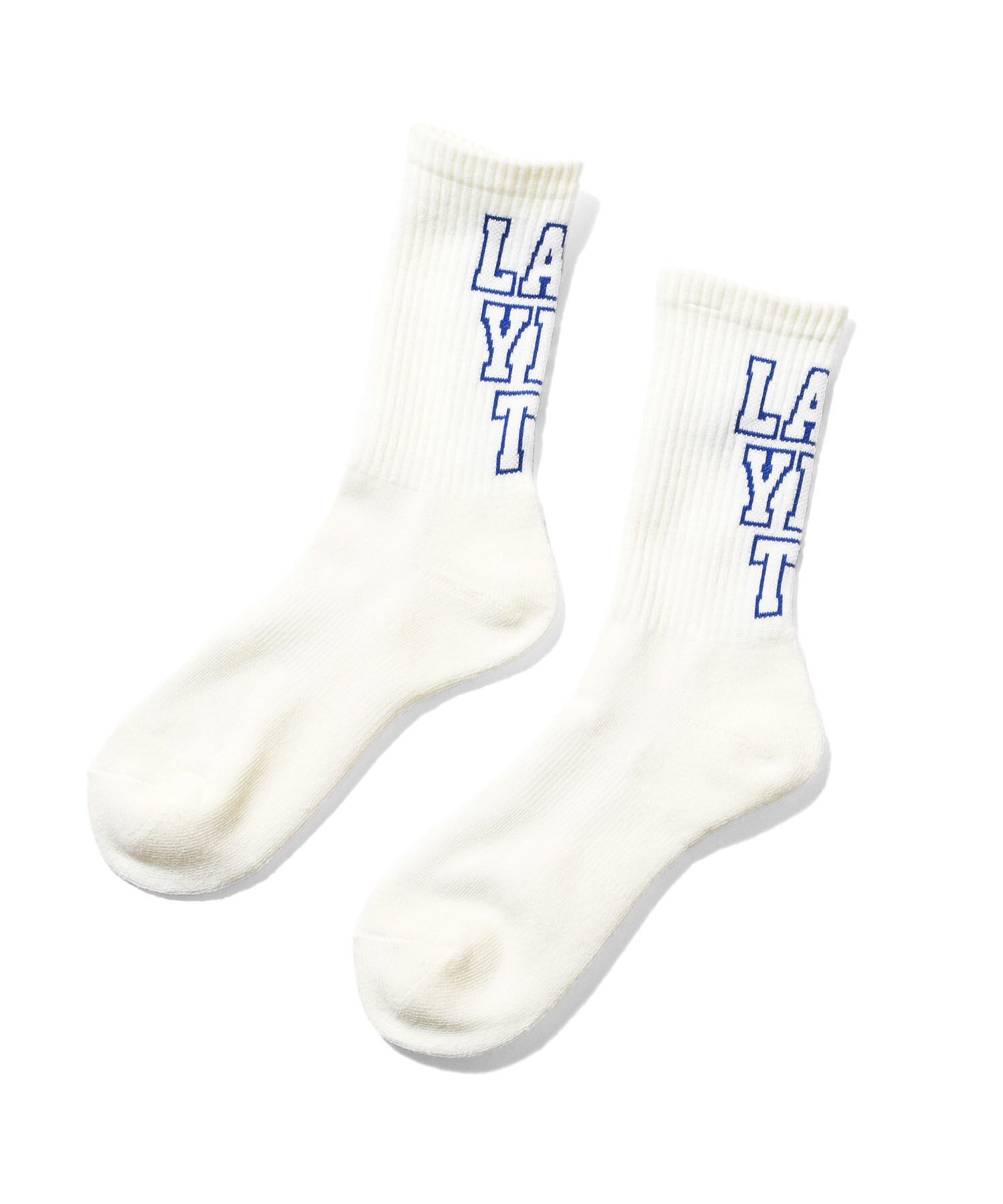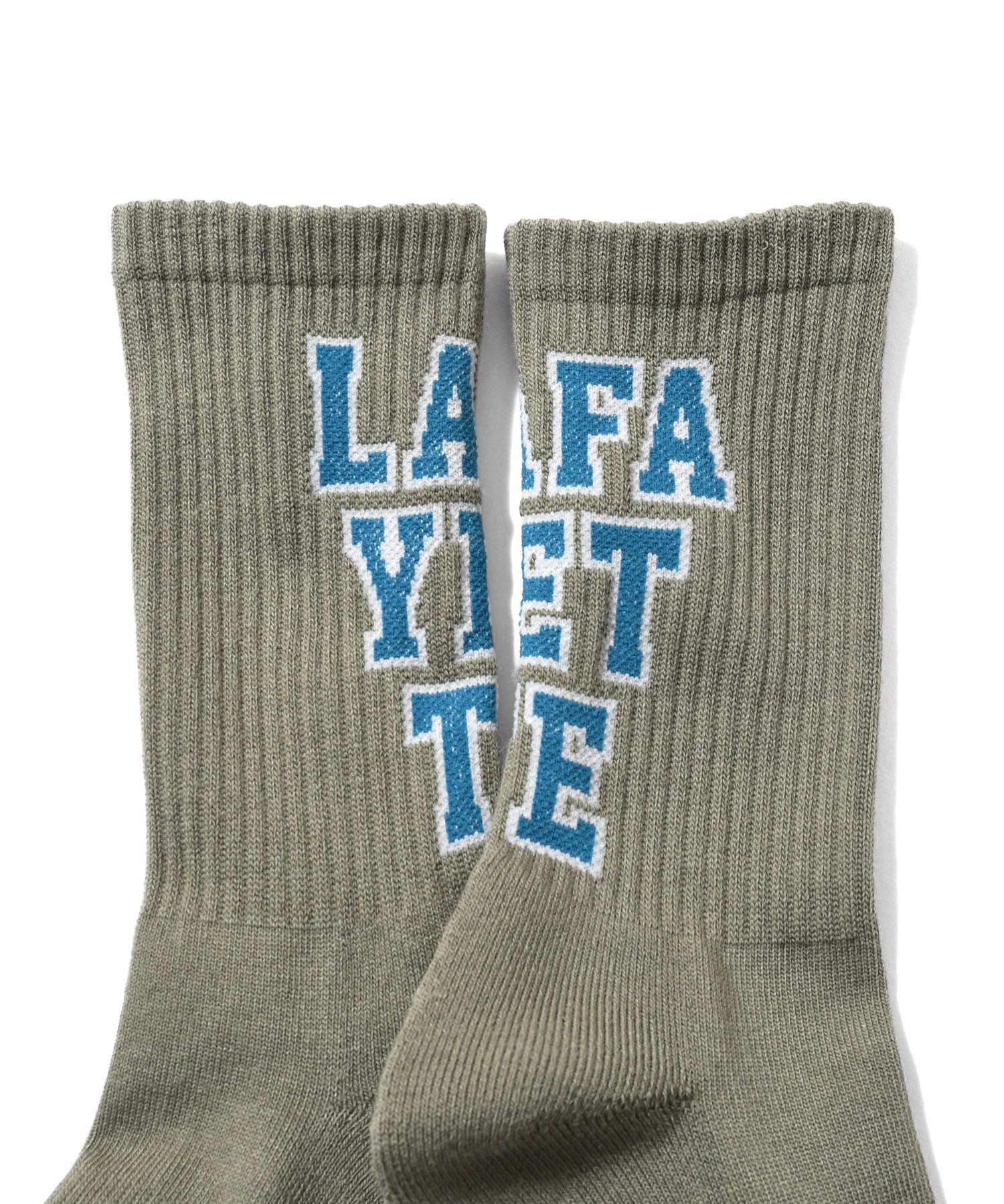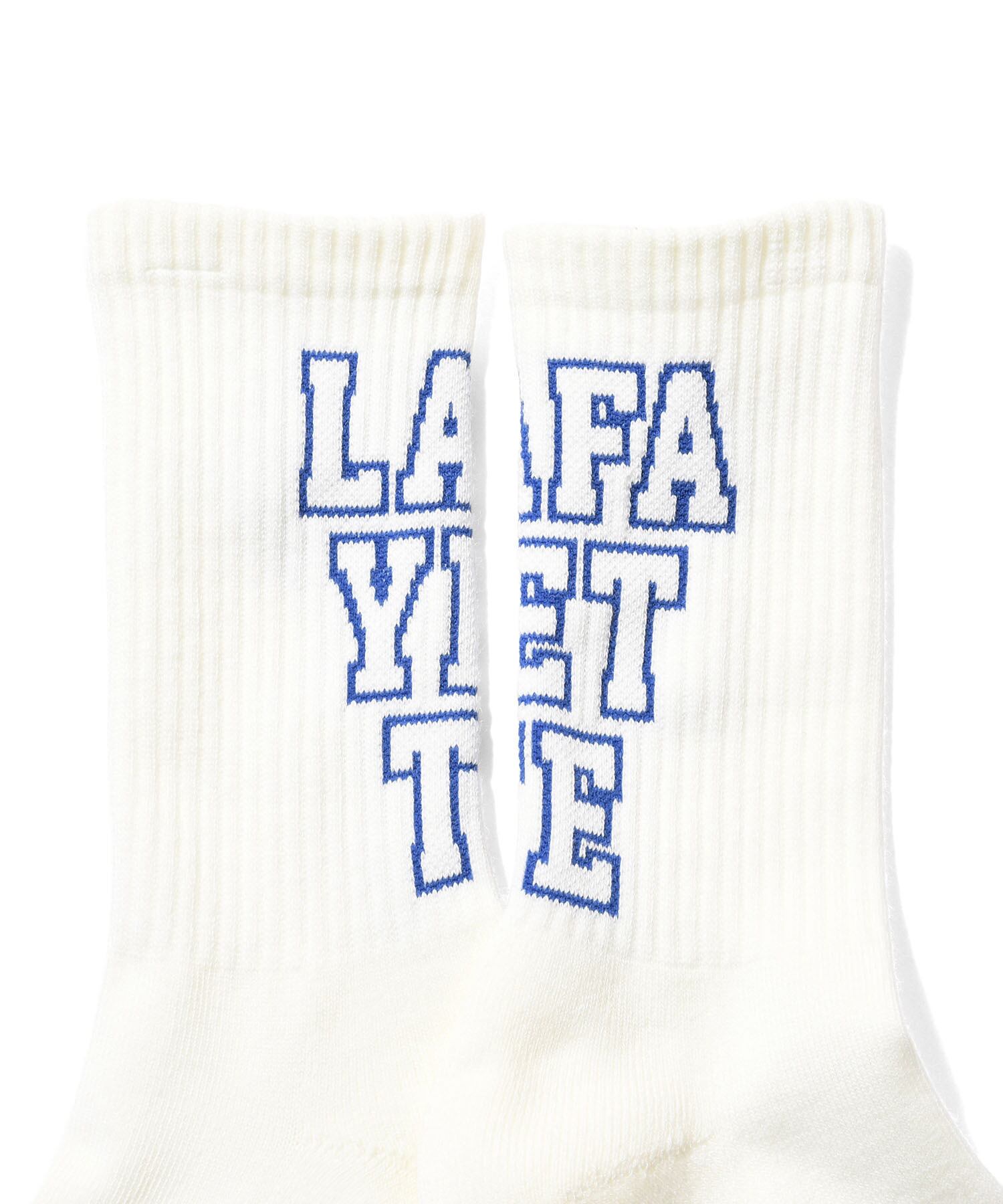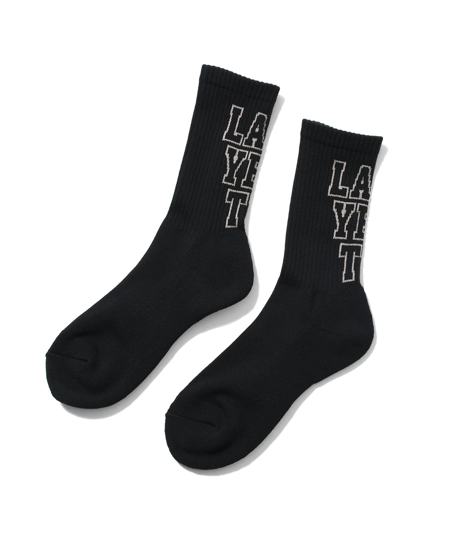 LAFAYETTEの文字を角ばったブロック体フォントで3段に配置したクルーソックス