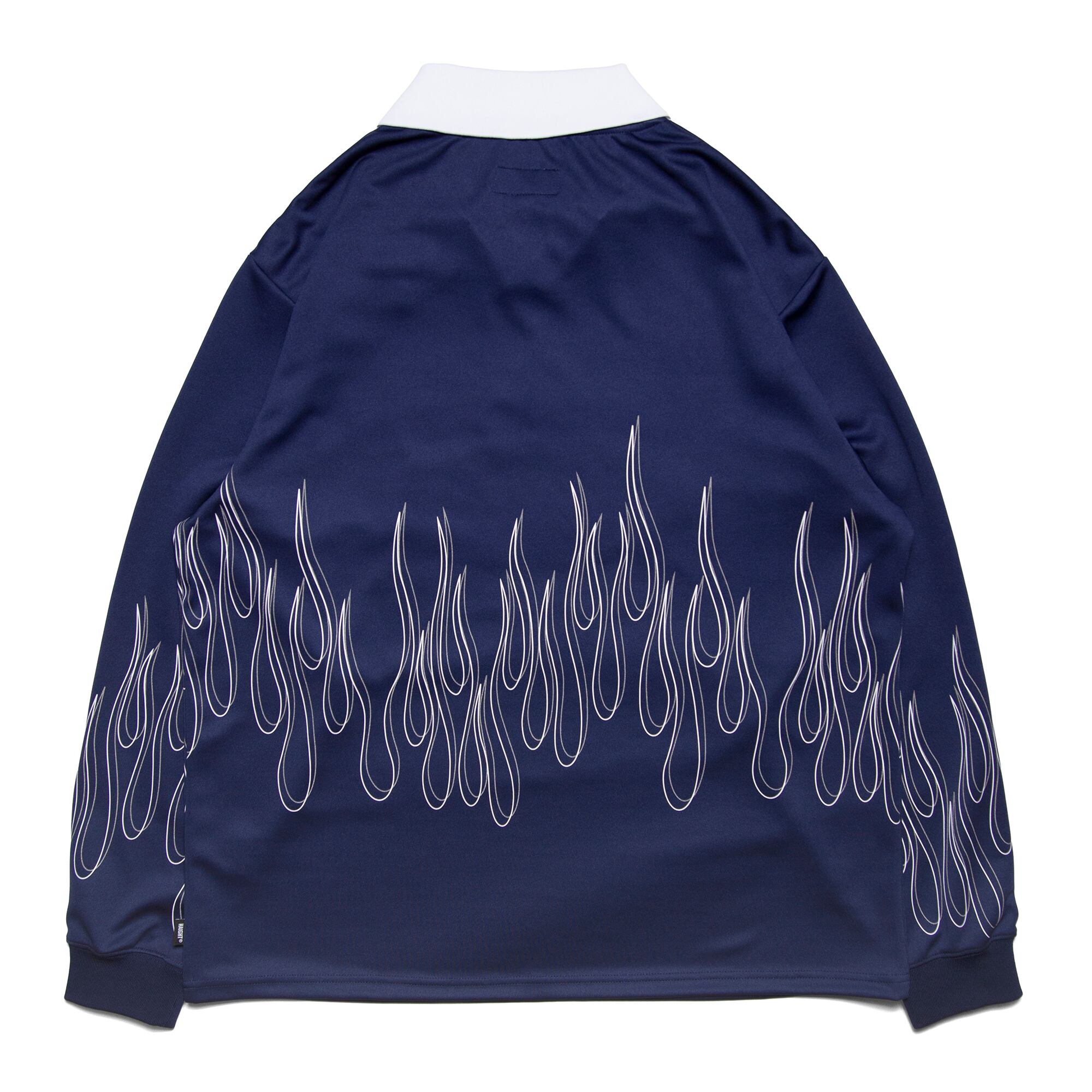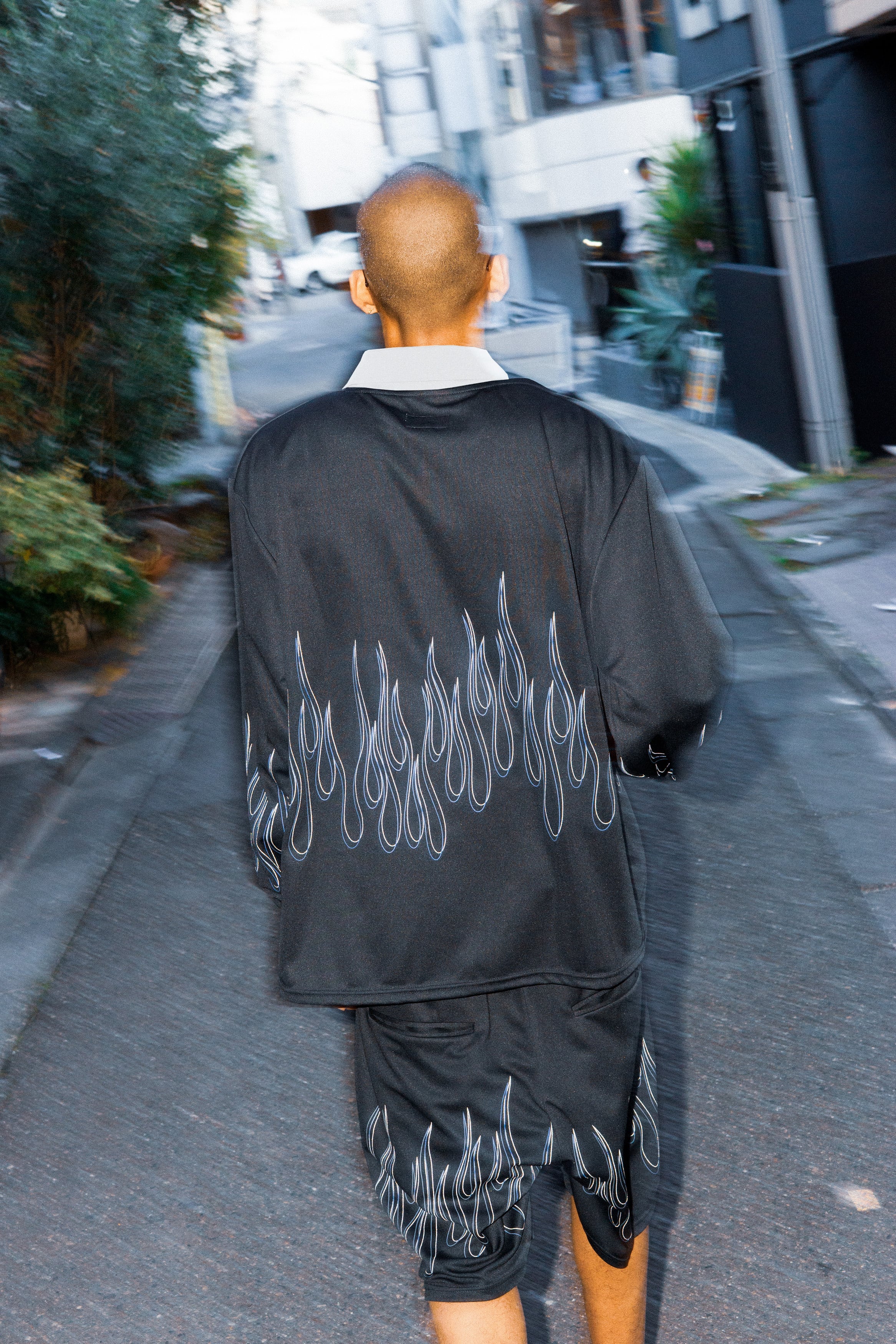 クラシカルな襟付きデザインをベースにしつつHAIGHTらしいエッジを効かせた一枚です。ボディ全体には、ピンストライプをベースに描かれたフレイムスグラフィックを採用。スポーツウェアの空気感とストリートのムードが交差する、存在感のあるデザインに仕上がっています。
