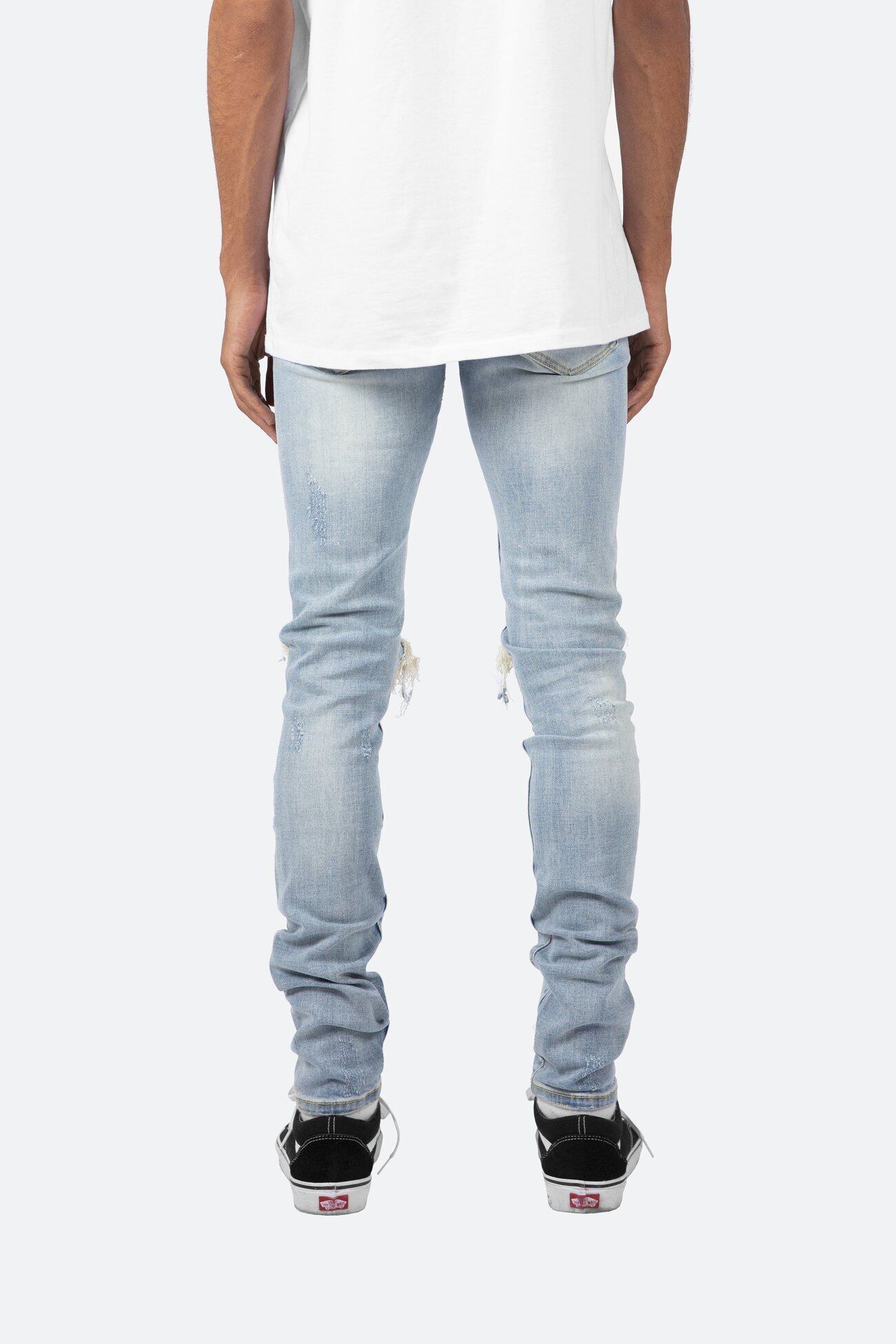 X1ストレッチデニムは新しいXフィットでデザインされており、全体がスキニーで、股下が伸びてスタッキングが可能で、水色のウォッシュと膝のカスタムディストレスが特徴です。