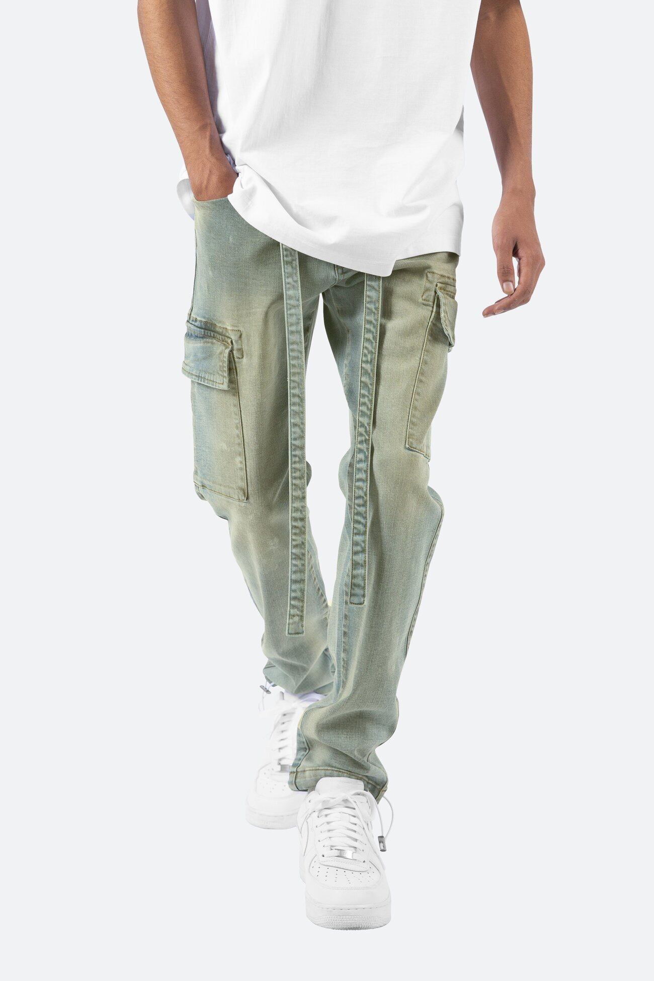 デニムカーゴパンツは、サイドシームにカーゴポケット、おそろいのベルト、ジッパーフライを備え、脚の開口部に伸縮性のあるドローコードで仕上げて、全体にリラックスしたフィット感でデザインされています。