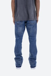 太ももまではスリムで裾部分にかけてフレアデザインになったブルーデニム。股下の内側部分から別生地で切り返し、膝から裾部分にかけて別のデニム地で切り返したデザインがストリートスタイルにマストなアイテム。フロントのボタンフライ仕様や適度なウォッシュ&ダメージ加工など細部にまでコダワリ抜いた一本。