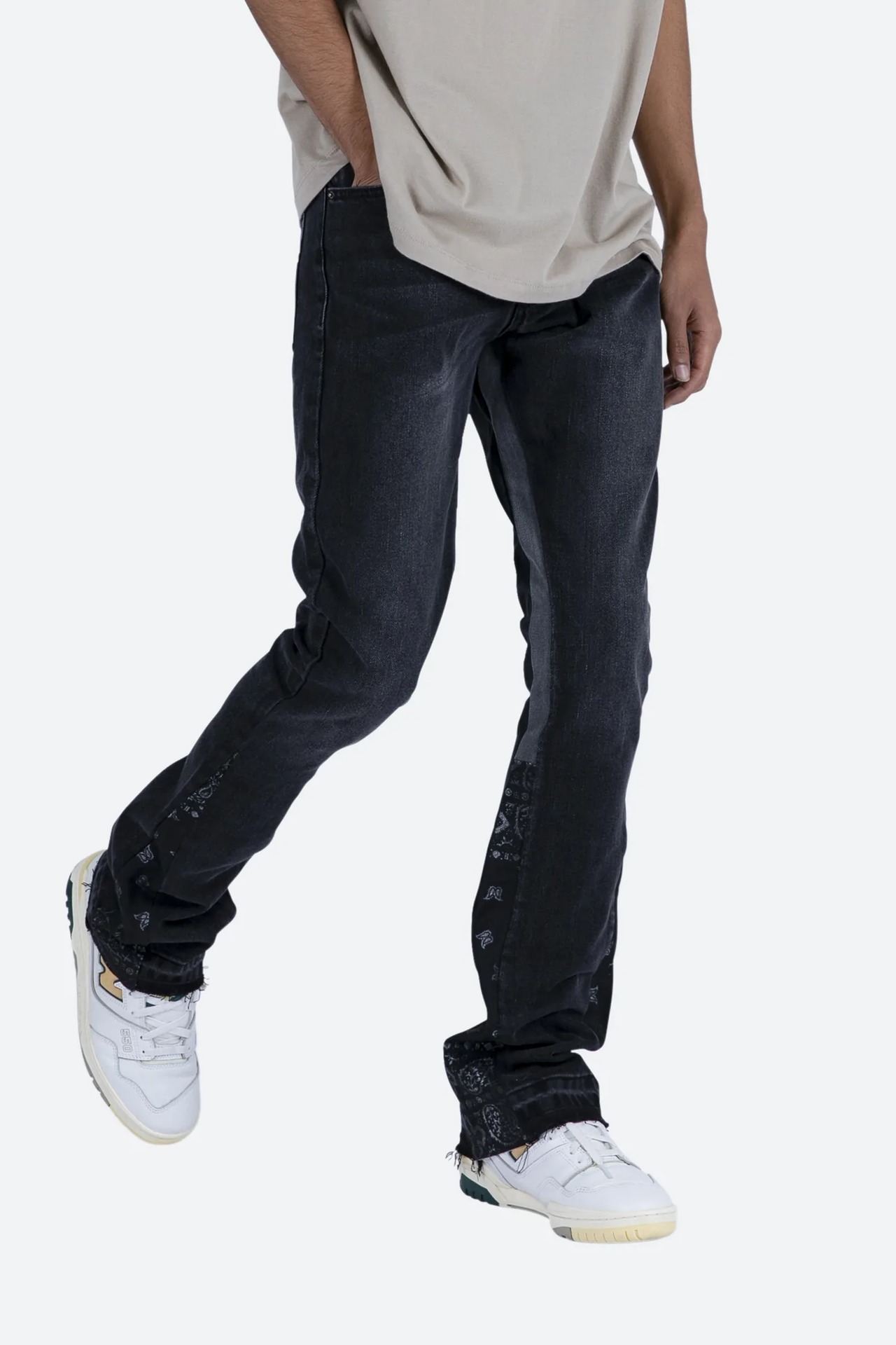 ペイズリーフレアデニムは、ウォッシュドブラックデニムを使用し、股下と股上にペイズリープリントデニムのパネルを配置して、わずかにフレアを出した新しいBフィットでデザインされています。