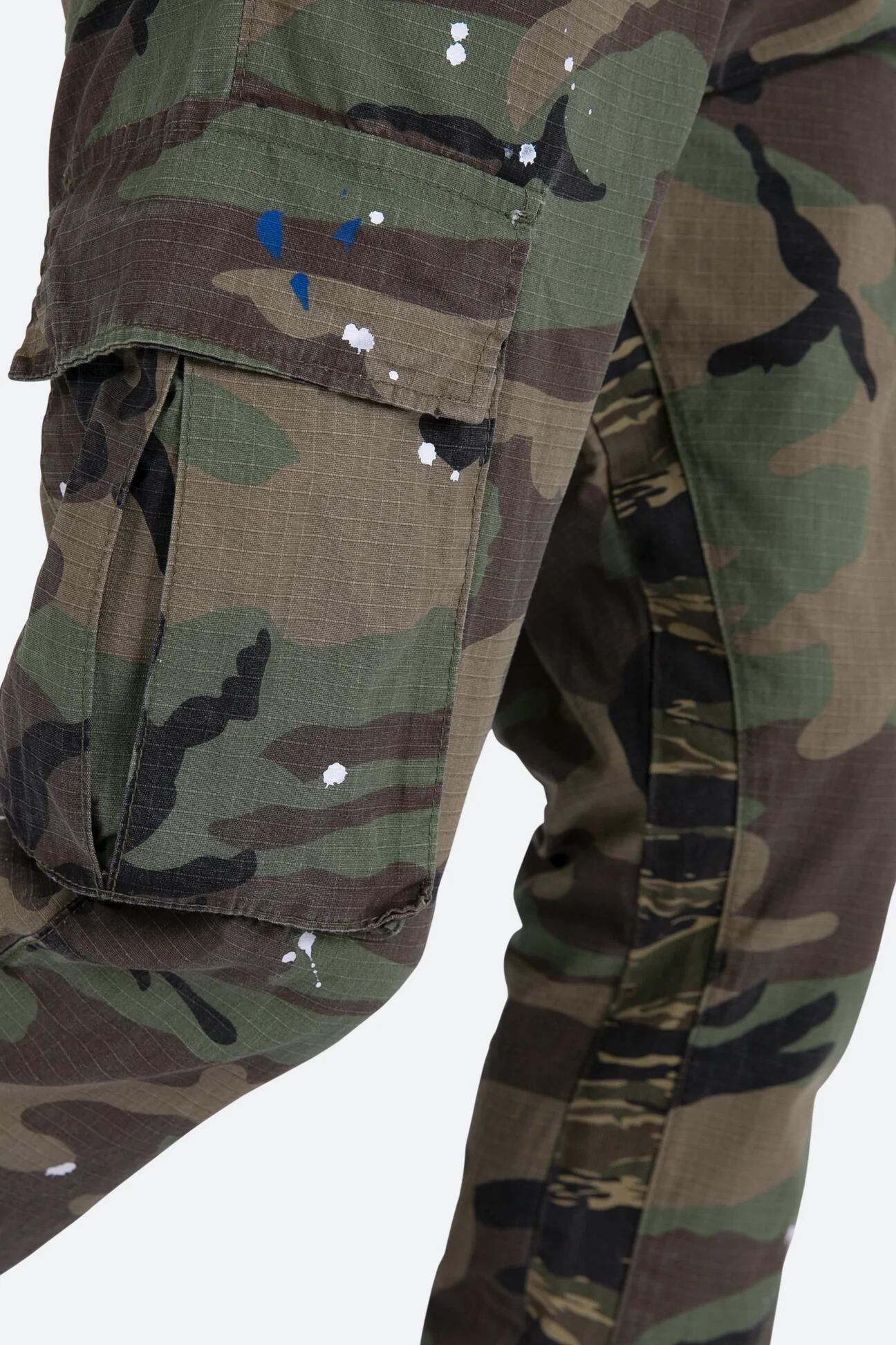 今季大人気のカモフラ柄にスプラッターペイント加工を施され、内側は股下から裾にかけてタイガーカモ柄を切り替えして落とし込み、