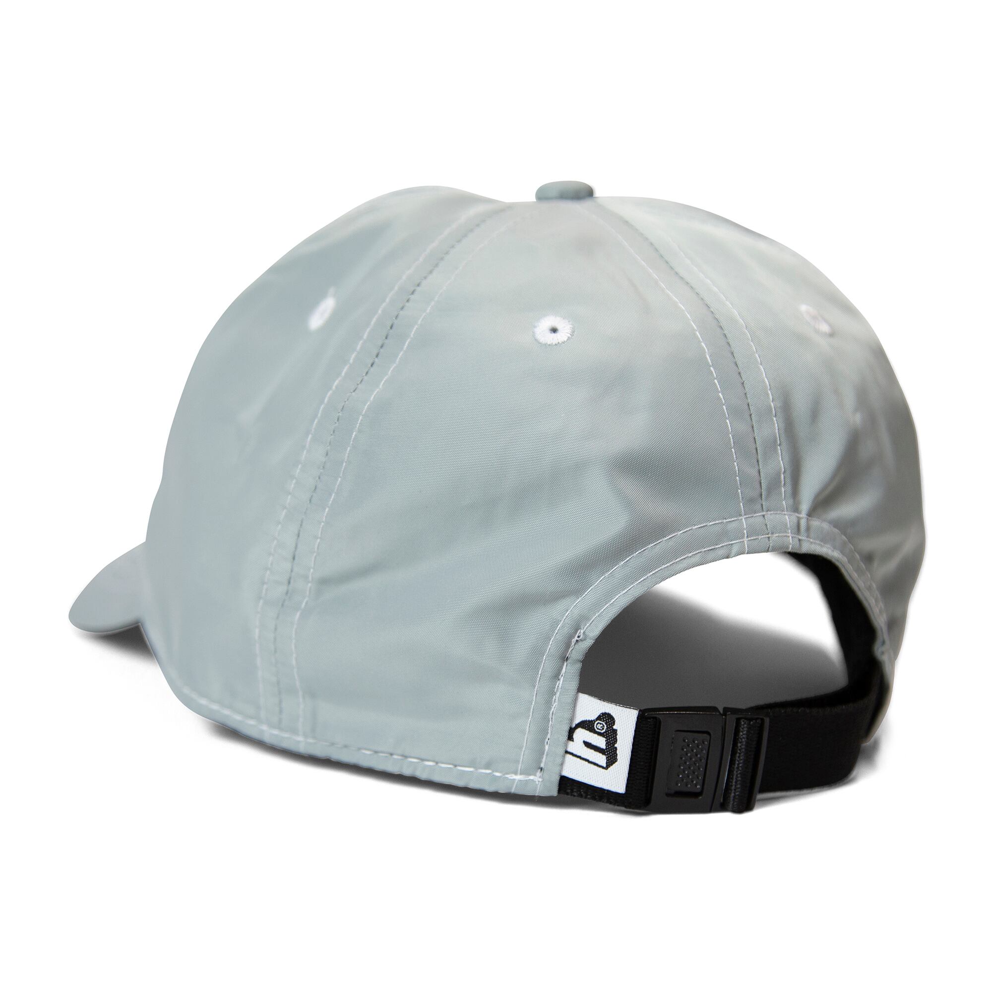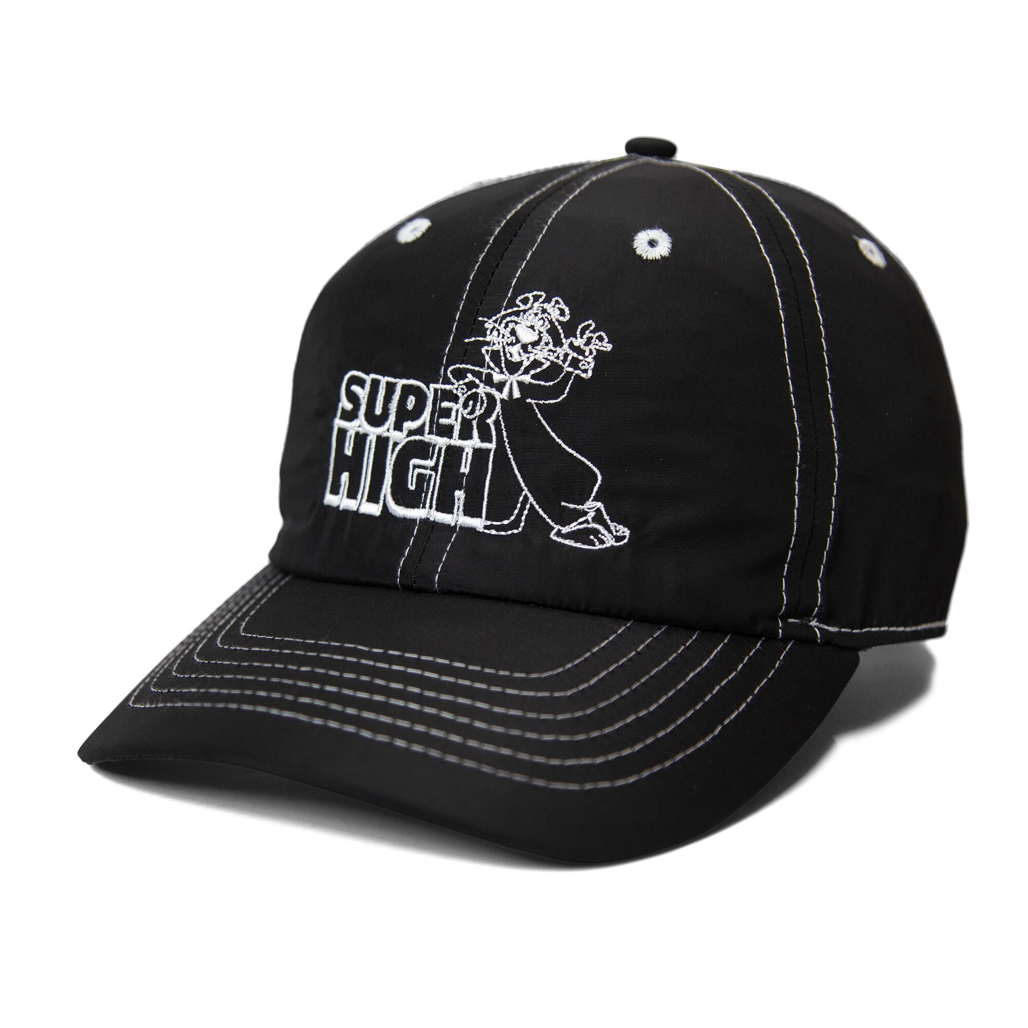 縫製の白糸のステッチが特徴的なキャップ。生地はポリエステルで軽く速乾性にも優れる。