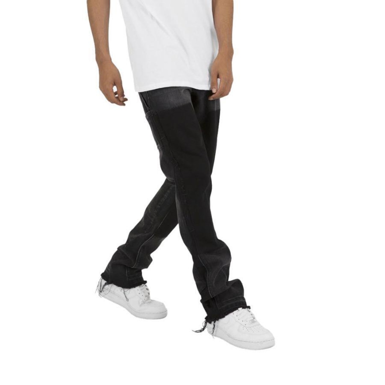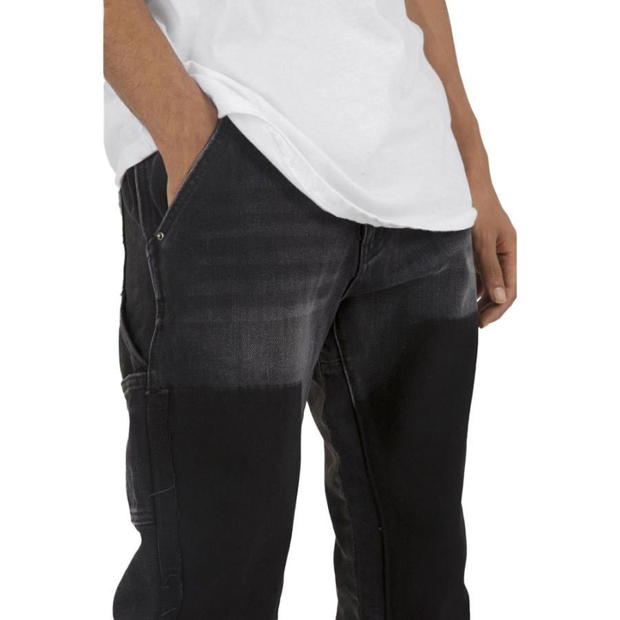 太ももにかけてスリムで、脚の開口部にわずかなフレアが特徴で、ウォッシュド ブラック デニムで作られています。ワーク パンツのパネルは洗濯後に取り外され、コントラストのあるウォッシュ エリアを実現しています。股下とアウトシームを少しフレアにし、デコンストラクトヘムで仕上げています。
