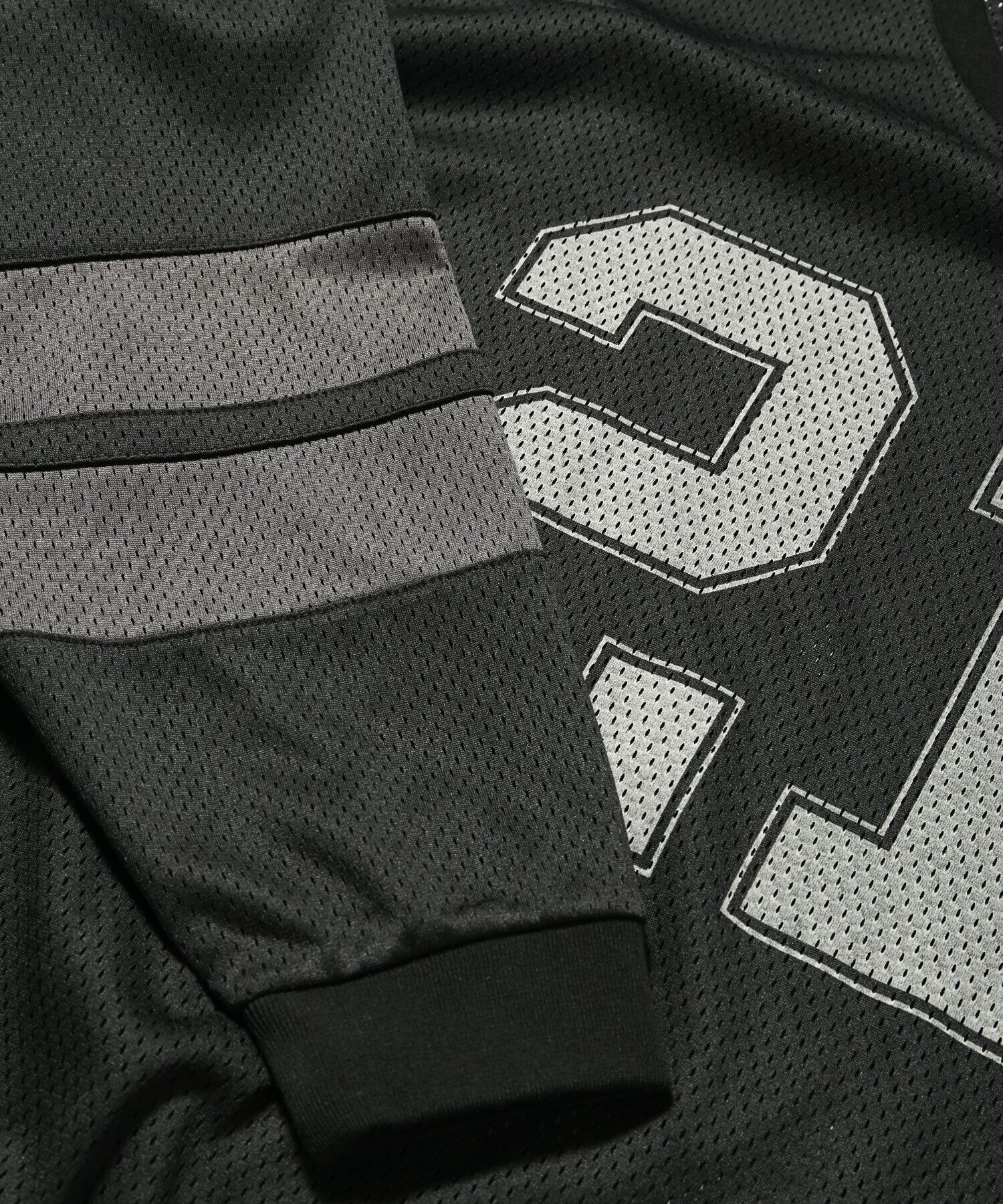 首元はリブ付きのVネック仕様、袖には本来のフットボールシャツにはないリブが付いたファッション性を意識したアイテム。