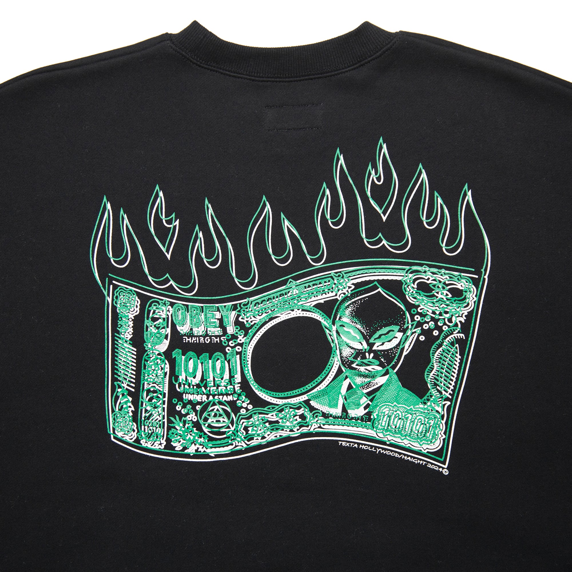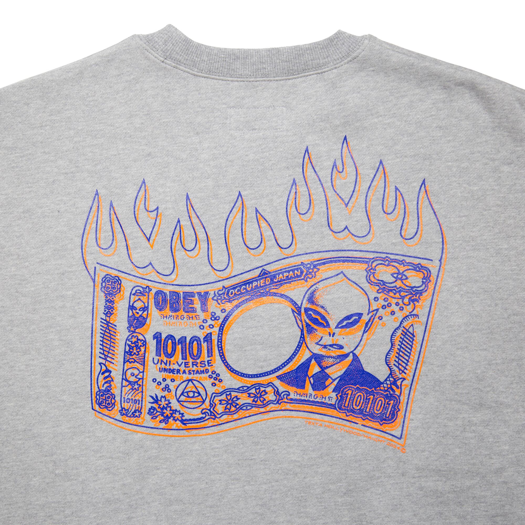 エイリアンと紙幣を組み合わせたクセのあるグラフィックが特徴的なデザインのクルーネックスウェット。